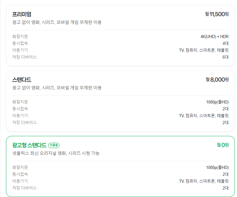 | 스탠다드 (광고 없음) | 4,900원 | 8,000원 | 12,900원 | 광고 없음, HD 화질, 저장 가능 |